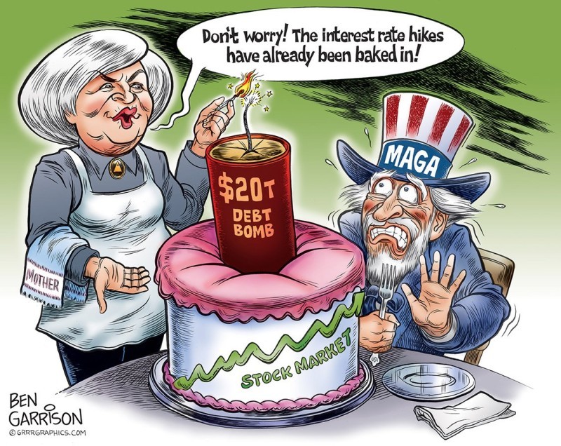 «Мамаша» Йелен — стороннику Трампа: «Не волнуйся, повышение процентных ставок в пирог уже «запечено». (MAGA — сокр. Make America Great Again, предвыборный лозунг Трампа). Карикатура Бена Гаррисона.