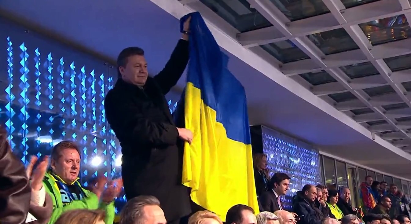 По данным очевидцев, присутствовавших на открытии Олимпиады, во время выхода украинской делегации Янукович приветствовал спортсменов, завернувшись в национальный флаг и при этом размахивая им.