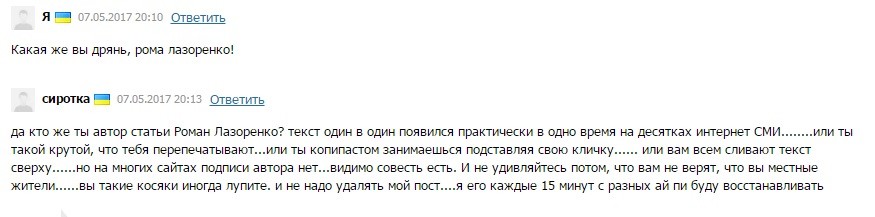 Статья вышедшая в преддверии главного праздника, когда то единой страны, 9 мая Дня Победы, даже у жителей города вызвала недоумение. Если конечно не обращать внимание на комментарии, которые пишут к стати сами редакторы и админы сайта. То люди понимают, что переписать историю не сможет никто, и сайт, который в очередной раз опозорил свой город, подлежит полному уничтожению. А писака Лазаренко с сайта 0629 - пусть ждет настоящей казни. Это я ему обещаю.