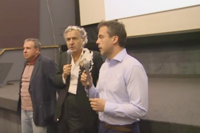 Кроме того, в этот момент один из активистов развернул на сцене транспарант с надписью «Бернар Леви поддерживает империалистические убийства».