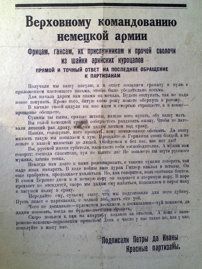 Министр внутренних дел ЛНР Игорь Корнет отметил, что эта "макулатура" очень похожа на ту, что в 1941-1942 годах разбрасывали гитлеровцы над позициями Красной Армии под Москвой, Севастополем, Ленинградом и Сталинградом.