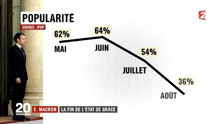 Сообщают, что самой непопулярной из недавно объявленных мер стало намерение властей сократить размер финансовой помощи в обеспечении жильём на 5 евро. Но в целом тут важно другое. Стремительное очарование сменилось столь же стремительным разочарованием. Всего за 100 дней Макрон потерял половину своего рейтинга. И пока конца этой тенденции не видно.