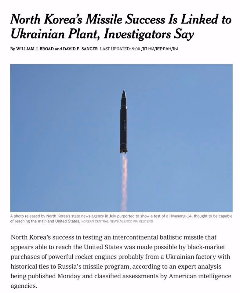 Газета The New York Times сообщила, что КНДР могла заключить контракт на поставку баллистических ракет с украинским заводом «Южмаш». Издание ссылается на заявление специалиста по вопросам ракетных технологий Международного института стратегических исследований Майкла Эллемана.