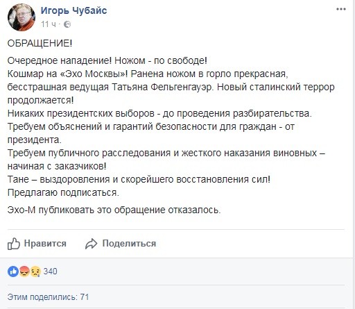 Либеральная общественность активно отреагировала на нападение гражданина Израиля Бориса Грица на журналистку "Эха Москвы" Татьяну Фельгенгауэр.