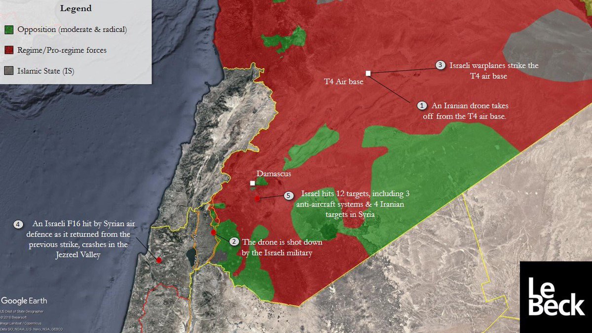 F-16 был сбит во время нанесения Израилем воздушного удара по иранской авиабазе Т-4 в районе Пальмиры, откуда управлялся вторгнувшийся накануне в воздушное пространство Израиля иранский БПЛА. Таким образом, продолжающееся столкновение выходит за рамки израильской конфронтации с Сирией и Ираном и серьезно ухудшает ситуацию с безопасностью на северной границе Израиля.