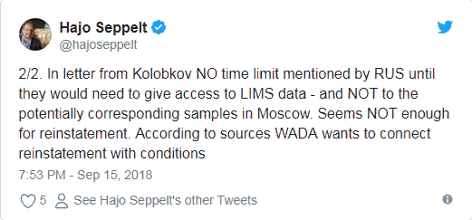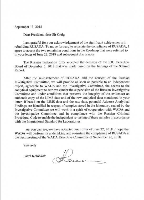 Немецкий журналист Хайо Зеппельт опубликовал в Twitter письмо, подписанное министром спорта России Павлом Колобковым и адресованное главе Всемирного антидопингового агентства (WADA) Крэйгу Риди. Это ответ на предложение компромисса в вопросе восстановления в правах Российского антидопингового агентства (РУСАДА).