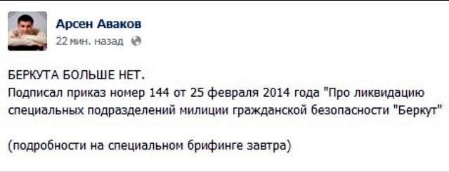 Самозванец мультимилиионер Арсен Аваков, типа и.о. главы МВД подписал приказ №144 от 25 февраля 2014 года "Про ликвидацию специальных подразделений милиции гражданской безопасности "Беркут".