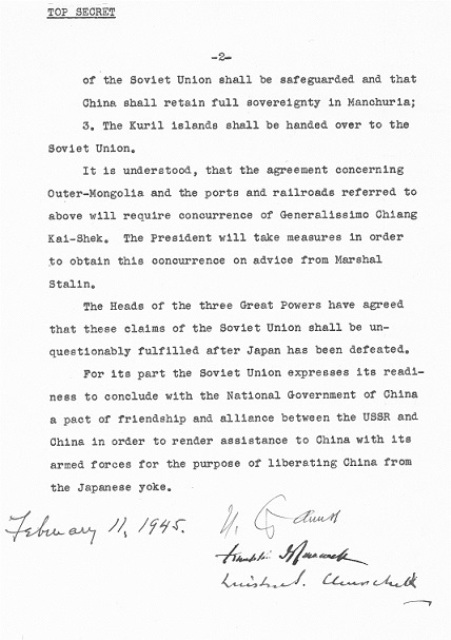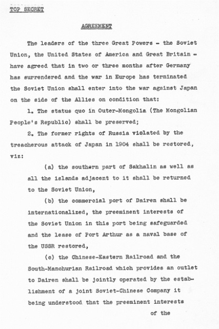 И, как итог договоренностей победителей: «Главы Правительств трех Великих Держав согласились в том, что эти претензии Советского Союза должны быть безусловно удовлетворены после победы над Японией».