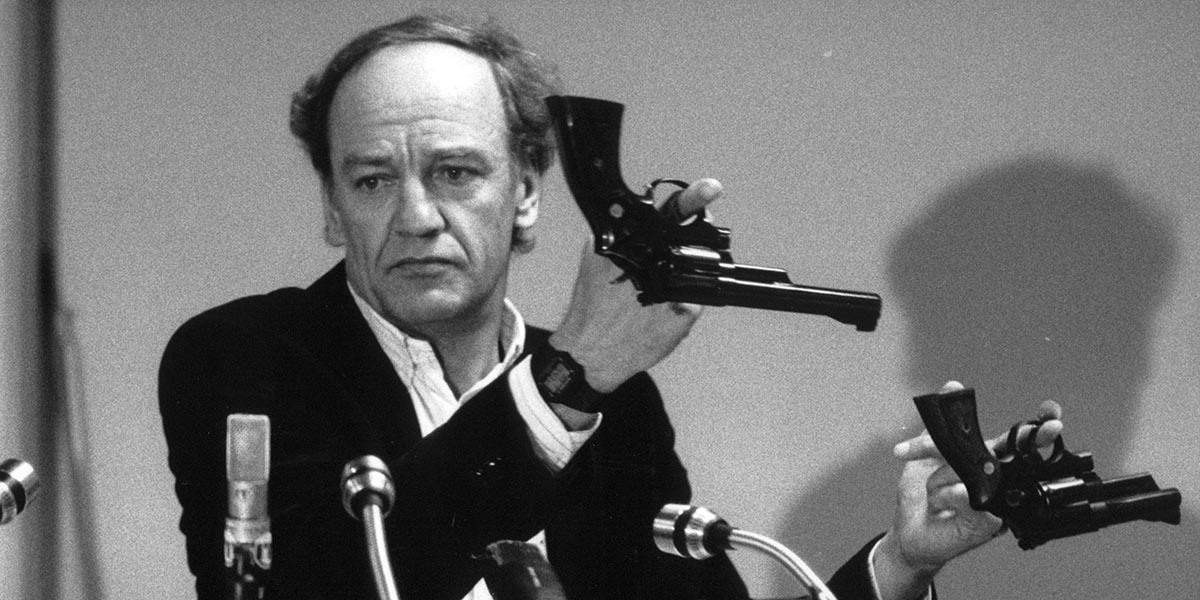 Ханс Хольмер, бывший глава расследования убийства Пальме, демонстрирует публике два револьвера Smith & Wesson, 1986 год