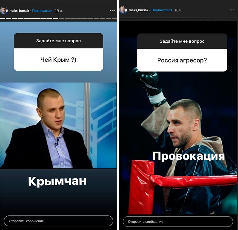 Так, один из пользователей спросил у боксера "Чей Крым?". На это спортсмен ответил: "Крымчан". На вопрос о том, является ли Россия агрессором, Бурсак написал: "Провокация".