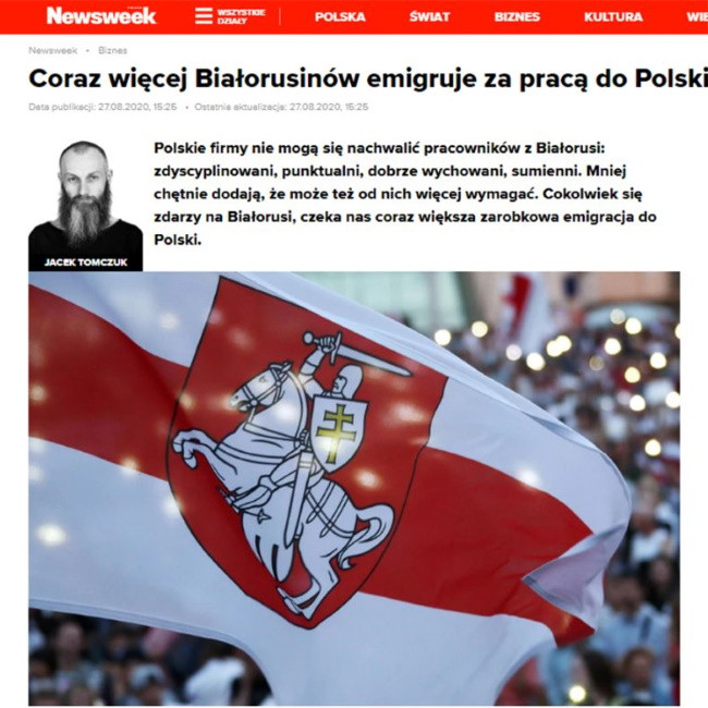 «В Польше сейчас на законных основаниях работают примерно 100 тысяч белорусов, что делает их второй по численности группой экономических мигрантов в стране после украинцев. Работодатели не требуют от них знания польского языка, на любом предприятии работает хотя бы один белорус или украинец, который и выступает переводчиком. Спрос очень велик, если бы сейчас приехала тысяча белорусов, им бы в момент нашли работу», – пишет Newsweek Polska.
