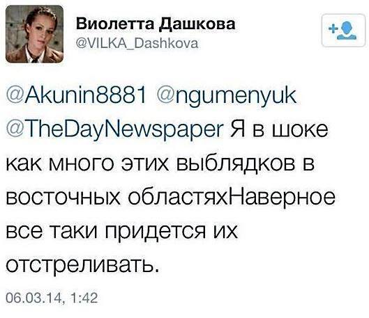 Интересный нюанс: пан Филатов, вице-гауляйтер Днепропетровщины при пане Коломойском, собирается, как мы уже знаем, после фарса 25 мая непокорных жителей Юга и Востока вешать, а девушка Вилка из Киева милосердно согласна "этих выблядков" всего лишь "отстреливать". Причем, судя по префиксу, во внесудебном порядке, но это как раз понятно: официальные казни Европа не одобрит.