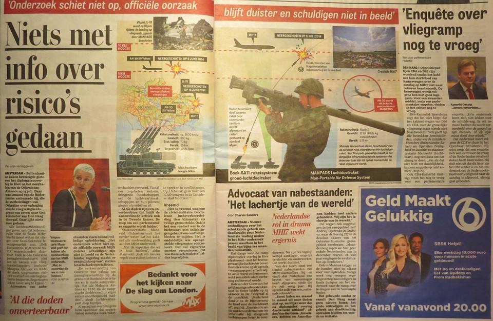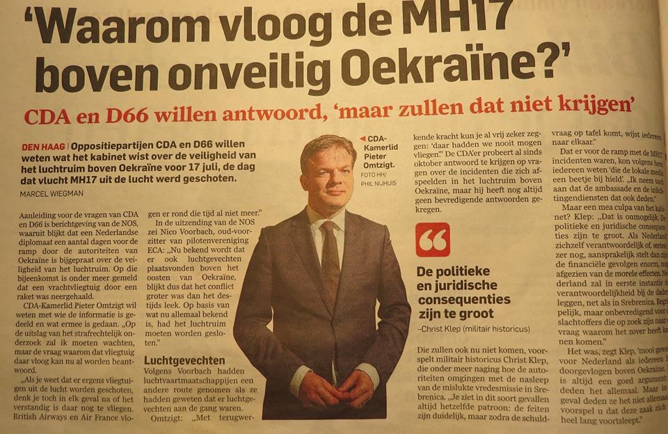 Эта информация вызвала живую реакцию адвокатов родственников погибших и страховых компаний. Те также требуют подробностей и уже готовят иски. Явно имеется в виду, что иски к Украине и Голландии. <>В сегодняшней газете AD депутаты от оппозиционных партий CDA и D66 задаются вопросом: "Почему полет рейса MH17 проходил над опасной Украиной?" (второй снимок). Как отмечают оппозиционеры, у них есть масса вопросов, на которые правительство Голландии все еще не может дать ответов. Они заявляют, что Нидерланды в этой ситуации выставлены на посмешище.