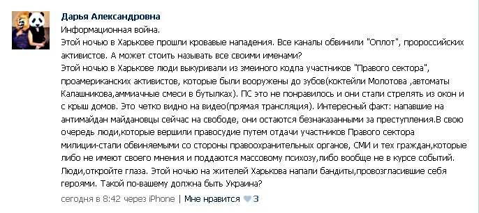Этой ночью в Харькове люди выкуривали из змеиного кодла участников "Правого сектора", проамериканских активистов, которые были вооружены до зубов(коктейли Молотова ,автоматы Калашникова,аммиачные смеси в бутылках). ПС это не понравилось и они стали стрелять из окон и с крыш домов. Это четко видно на видео(прямая трансляция). Интересный факт: напавшие на антимайдан майдановцы сейчас на свободе, они остаются безнаказанными за преступления.В свою очередь люди,которые вершили правосудие путем отдачи участников Правого сектора милиции-стали обвиняемыми со стороны правоохранительных органов, СМИ и тех граждан,которые либо не имеют своего мнения и поддаются массовому психозу,либо вообще не в курсе событий. Люди,откройте глаза. Этой ночью на жителей Харькова напали бандиты,провозгласившие себя героями. Такой по-вашему должна быть Украина?