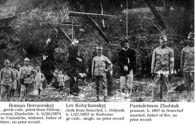 Австро-Венгрия? Есть мнение, что географический термин украинец (житель окраины) стал этнонимом отдельного от русских народа тогда, когда современная западная Украина вошла в состав Австро-Венгрии. Именно в Австро-Венгрии русофилов-униатов просто убили. Когда разразилась Первая мировая война начался массовый антирусский террор в Галичине. Австрийцы понимали, что русофилы-униаты — это потенциальные «сепаратисты симпатизирующие России». И австрийцы очень по-немецки решили эту проблему.
