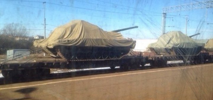 Да-да, вы правильно поняли — это Т-14 Армата. На платформах танки под брезентом и маскирующим силуэт каркасом, поэтому ничего не понятно, и не гадайте. Видны только 7 катков ходовой части и пухло длинной почти на метр больше обычного.