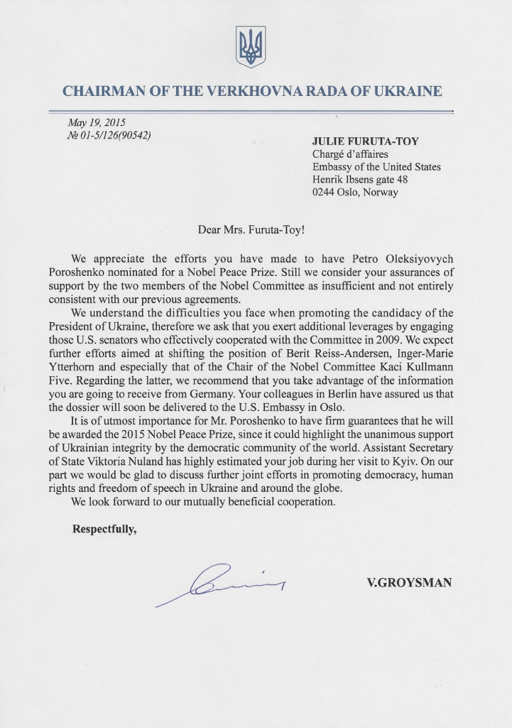 В этом году посол США в Норвегии Джулия Фурута-Той прилагает огромные усилия по выдвижению кандидатуры украинского президента Порошенко на получение премии. Как видно из письма председателя Верховной Рады Украины Владимира Гройсмана, американский посол смогла получить поддержку двух членов Комитета. Тем не менее, он просит г-жу Фуруту-Той подключить тех американских сенаторов, которые «успешно сотрудничали с Комитетом в 2009 году», чтобы заручиться поддержкой оставшихся трех членов и, в особенности, председателя Комитета г-жи Каси Кульманн Фиве.