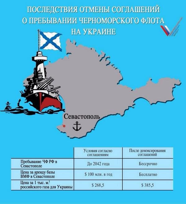 Украина за 2013г купила 27,3 мрд куб. м газа, и если допустим купит в 2014 году по новой цене без скидок хотя бы 15 мрд куб. м газа, то получается Россия благодаря отмене скидки за базирование Черноморского флота получит 1,5мрд.$, тут даже 100 млн $ за отмену аренды морской базы мелочь. Сэкономив 1,5мрд.$ Россия влаживает их в развитие Крыма и Севастополя в ближайшие годы, а потом пойдёт чистая прибыль.