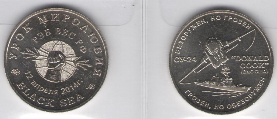 Так на аверсе памятной монеты указано "Су-24" и "Donald Cook (ВМС США)", нарисован сам эсминец, летящий над ним бомбардировщик, а также два предложения - про Су-24 "Безоружен, но грозен", а про корабль НАТО "Грозен, но обезоружен".