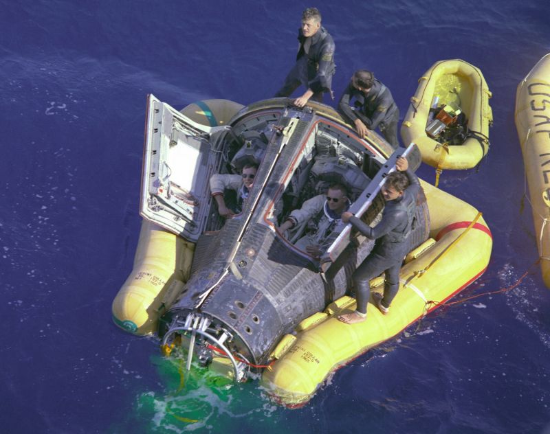 Никаких, простите, фейков и «макетов для тренировок» — вот как бы реальный аппарат после спуска, обгоревший, с астронотами Армстронгом и Скоттом внутри, после приводнения: