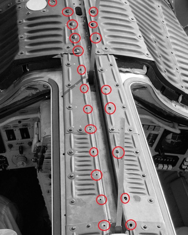 Кстати, на этой же фоточке видно, что никакого дополнительного крепления люка со стороны петель нет, и что люк уплотняется стрёмным антинаучным уплотнителем по типу уплотнителя двери холодильника. Поверьте мне — это выглядит смешно. Русские делают люки своих спускаемых аппаратов вставными изнутри — давление их прижимает к резинке уплотнителя и обеспечивает герметичность. У американцев же применена дурацкая конструкция, потенциально склонная к травлению и утечкам. Впрочем, после винтиков с шайбами это так, мелочь.