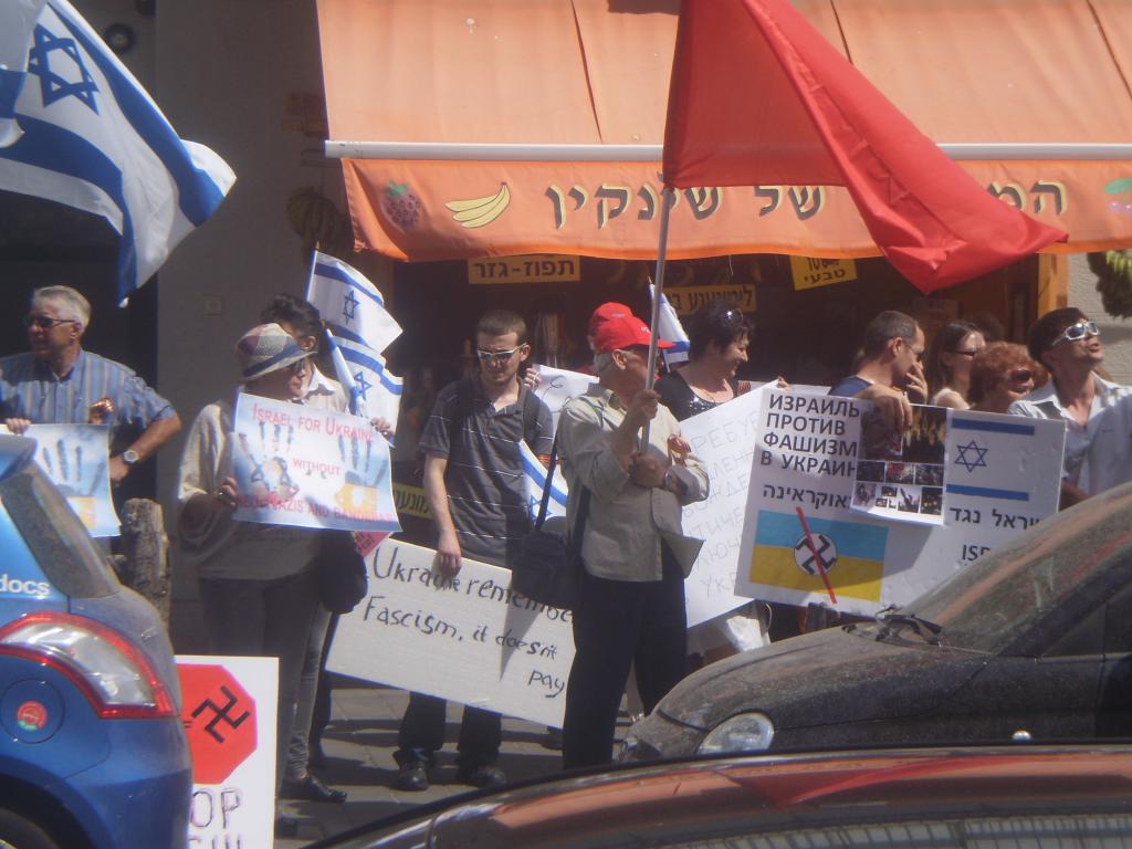 Приезжала съемочная группа 9-го канала вместе с Гранкиным, который был освистан. Пока протестующие стояли там, мимо проехала колонна машин, украшенных украинскими флагами и символикой "Правого сектора" (в Тель-Авиве, N.B.). Они сигналили и пытались мешать. Полиция их прогнала. На мужчину, стоявшего с краю, набросился какой-то тип, розмовлявший мовою в львовском варианте, его тоже оттащили. Больше инцидентов не было.