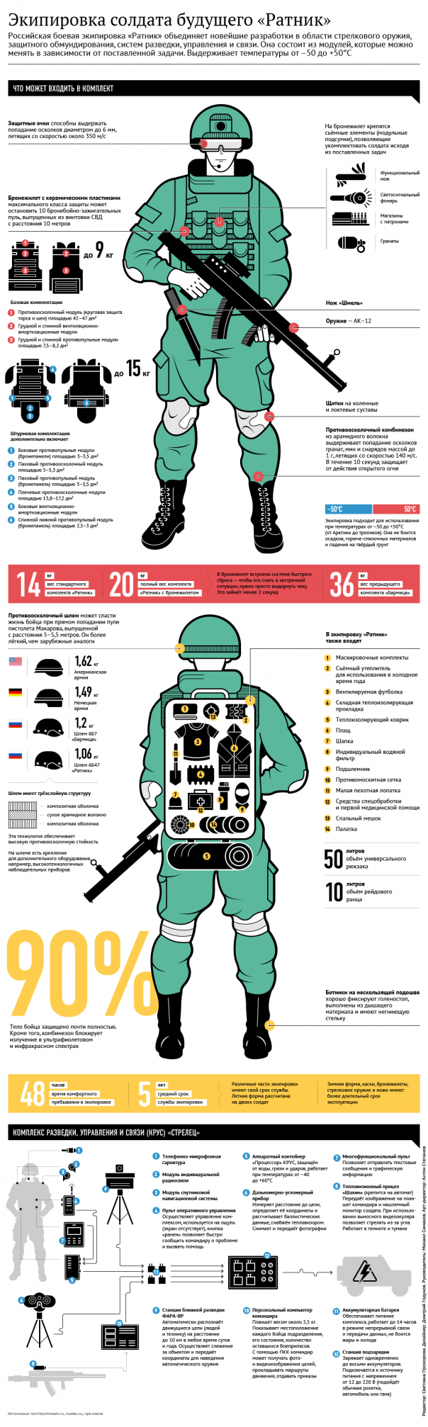 Серийные поставки в российские вооруженные силы экипировки "солдата будущего" второго поколения "Ратник" начались в 2017 году. Ее комплект объединяет современное стрелковое вооружение, эффективные комплекты защиты, средства разведки и связи — около десяти различных подсистем. Он предназначен для действий в различных климатических условиях и в любое время суток.