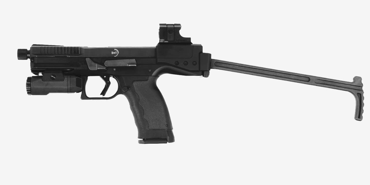 Главная проблема со всеми перечисленными «чемоданчиками с прикладом» состоит в том, что они ощутимо увеличивают не только длину, но и ширину, и высоту оружия, и добавляют до килограмма веса. Это не беда, если оружие носится открыто на ремне, подобно карабину, но иногда хочется компактности и прикладистости в одном флаконе. И тут красиво выступили швейцарцы из компании B&T AG.