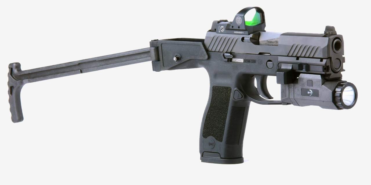 Пару лет назад они показали «универсальное служебное оружие» — служебный пистолет, специально «с нуля» спроектированный для использования с интегрированным в конструкцию складным вбок прикладом. От обычных пистолетов B&T USW отличается лишь удлинённой назад рамкой, в задней части формирующей кожух, в который изнутри откатывается затвор (чтобы ненароком не свернул нос стрелку при слишком «плотной» вкладке).