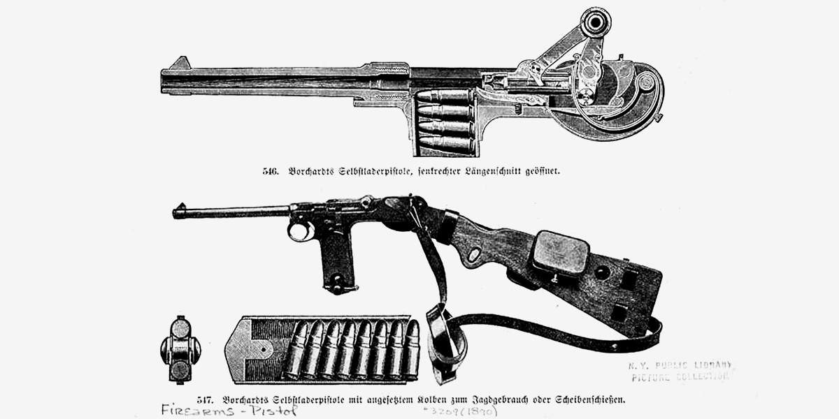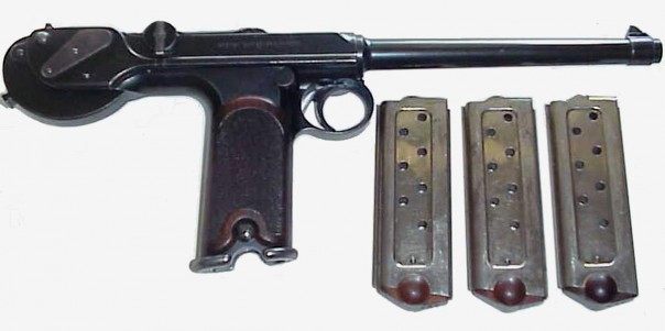 Однако с короткоствольным оружием дело обстояло несколько иначе. Уже в 1893 году в серию запустили самозарядный пистолет Борхарда С93, имевший отъёмный коробчатый магазин, расположенный в рукоятке. Благодаря малым габаритам пистолетных патронов такая компоновка была гораздо удобнее и компактнее, нежели «винтовочная», с расположением магазина перед спусковой скобой, принятая для ранних пистолетов Маузера и Бергмана.