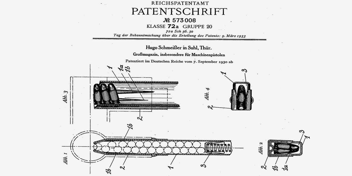 Именно Гуго Шмайсер в 1920 году, при переделке своего МР.18 с барабанного магазина ТМ.08 от пистолета Люгера на коробчатый, из соображений минимизации трудозатрат сохранил подачу патронов в ствол «в один ручей». Он создал для МР.18 и его наследника МР.28 коробчатые магазины с выходом патронов в один ряд, концептуально похожие на магазины пистолетов Сэвидж.
