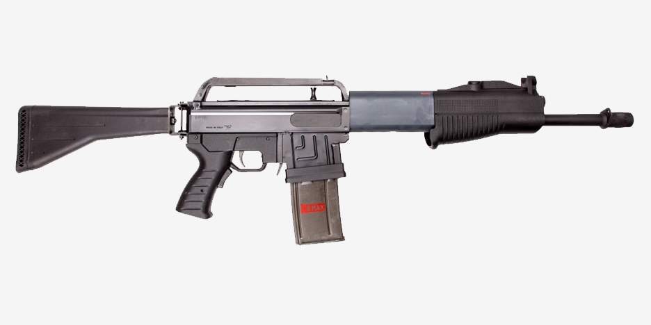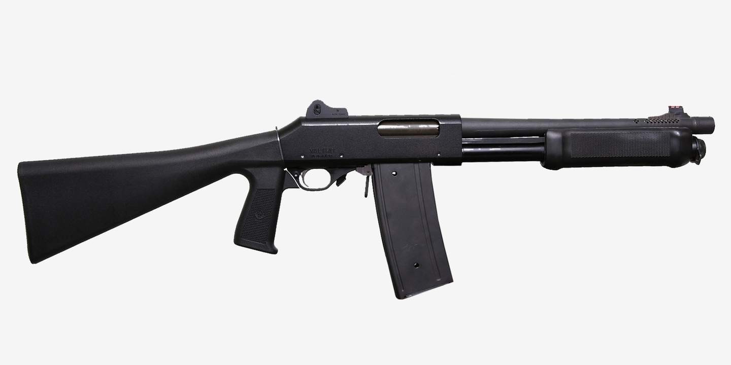 Силуэт, больше смахивающий на обычную магазинную винтовку со складным прикладом, на самом деле принадлежал помповому итальянскому ружью «Вальтро» РМ-5, которое попадалось в продаже и на отечественном рынке. Необычность его состояла в применении отъёмного магазина. РМ-5 было, пожалуй, первым серийным оружием такой компоновки, получившим распространение на гражданском рынке.