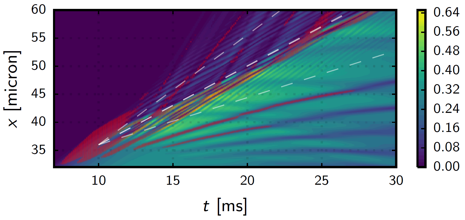 Нижняя диаграмма — это увеличенный фрагмент среднего кадра в нижнем ряду рисунка 1. На нижней диаграмме показана одномерная симуляция общей плотности как функции от времени в регионе, где впервые проявилась динамическая нестабильность.