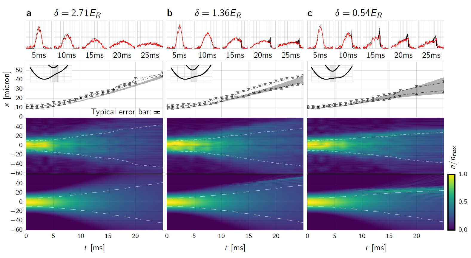 Рисунок 1. Анизотропное расширение конденсата Бозе — Эйнштейна с разными коэффициентами силы сцепления. Реальные результаты эксперимента обозначены красным, результаты предсказания в симуляции — чёрным