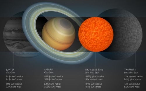 Ученые-астрономы из Кембриджского университета обнаружили звезду, размер которой ненамного превышает размер Сатурна, что делает эту звезду, EBLM J0555-57Ab, самой маленькой из всех звезд, известных современной науке. Размер звезды EBLM J0555-57Ab уже практически равен физическому пределу, при которой термоядерный реактор звезды еще может перерабатывать в гелий свое водородное топливо. При этом, крошечная звезда является одним из самых плотных объектов, гравитация на ее поверхности в 300 раз превышает земную гравитацию.
