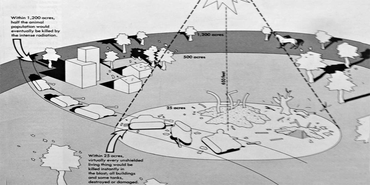 Взрывы нейтронных зарядов на полигоне в пустыне Невада в США показали, что в радиусе нескольких сот метров ударная волна сносит все здания и постройки.
