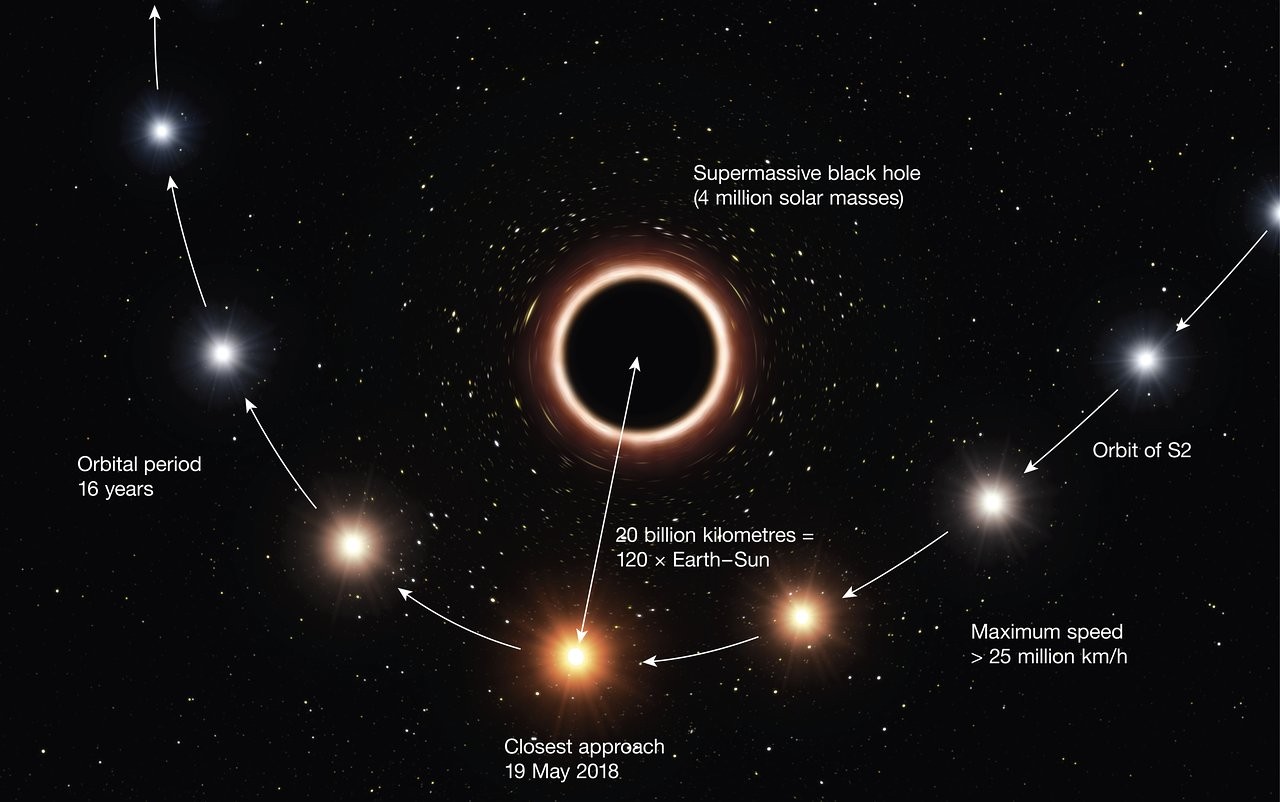 В своей работе, представленной в журнале Astronomy & Astrophysics, ученые описывают наблюдения звезды S2, которая совершает один оборот вокруг черной дыры за 16 земных лет по очень эксцентричной орбите. При максимальном приближении к сверхмассивному монстру S2 оказывается на расстоянии не более двадцати миллиардов километров от него, что всего в 120 раз больше, чем расстояние от Земли до Солнца, или вчетверо больше, чем расстояние от Солнца до Нептуна.