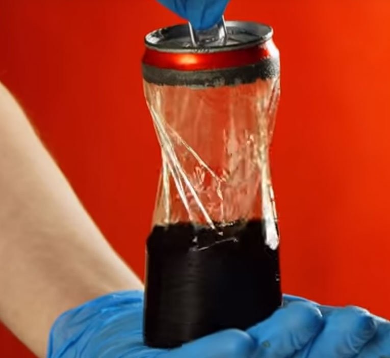 В результате алюминий действительно исчез, но находившаяся внутри газировка осталась на месте: ее удерживают тонкие пластиковые стенки.