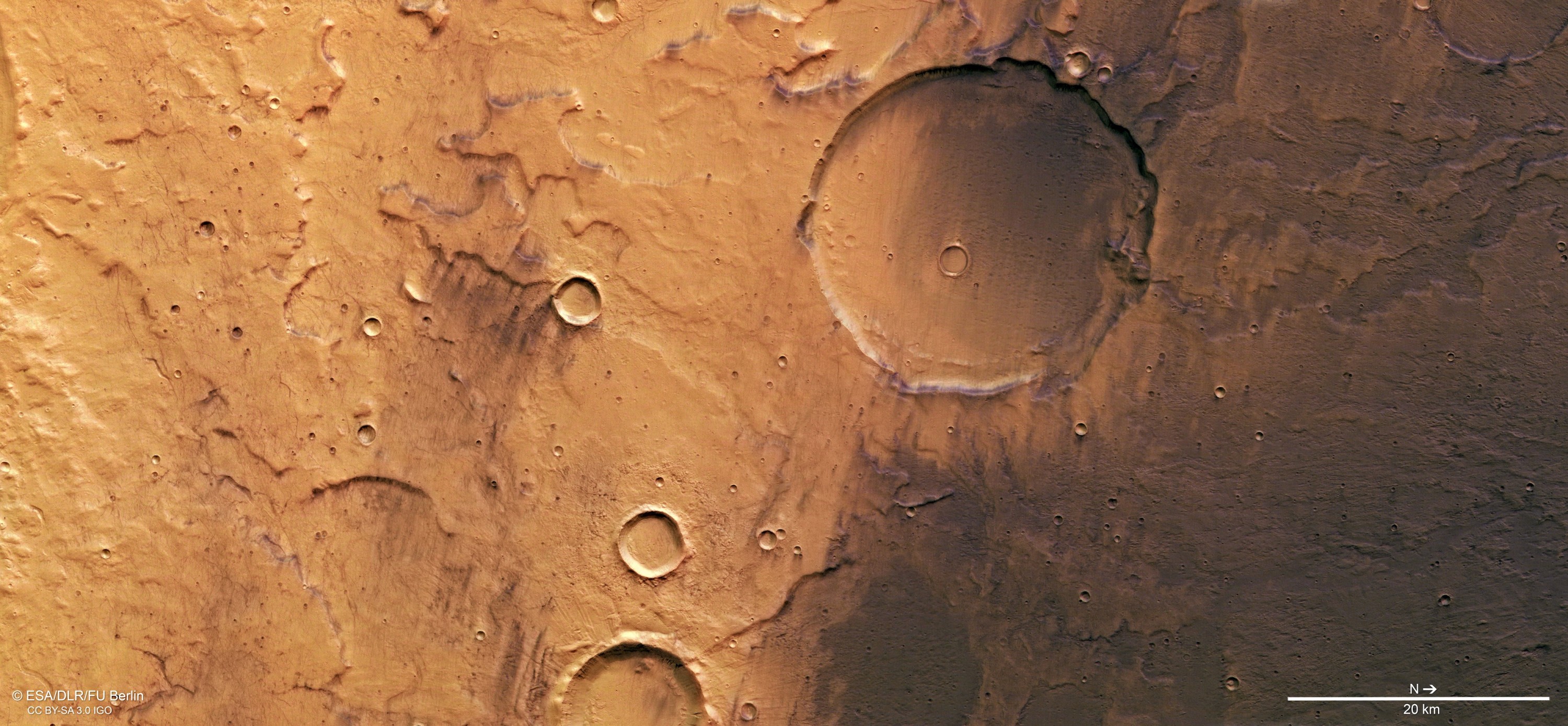 Крупнейший из кратеров на отснятом участке имеет диаметр 25 км и максимальную глубину 300 м. Если присмотреться, то на изображениях можно увидеть характерные темные полосы. Часть из них является следами, оставшимися после пылевых смерчей, а часть указывает на преобладающие в этом регионе ветра.