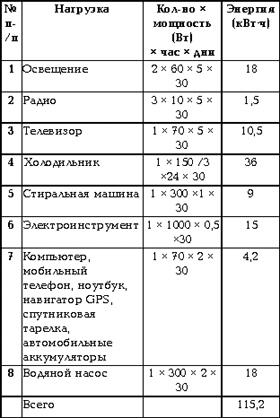 Между тем подсчитана средняя "энергетическая корзина" сельского жителя, к которым, по меньшей мере в летний период, вполне можно причислить и владельцев дачных коттеджей. Она составляет 115 киловатт-часов в месяц. Цифра взята не с потолка. Она складывается из требований обеспечения так называемого "интеллектуального быта". Это освещение, радио, телевидение, бытовой холодильник, электробритва, кипятильник, мелкий электроинструмент, компьютер, огородный насос, утюг. Не забудем и то, что за последнее время появилось много бытовой техники, работающей от встроенных аккумуляторов, которые необходимо периодически подзаряжать: фонарики, мобильные телефоны, те же электробритвы, электроинструмент и др.