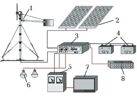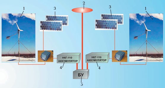 Схема автономного комплекса, обеспечивающего энергией береговой маяк: 1 - ВЭУ; 2 - светооптический аппарат; 3 - солнечные батареи; 4 - аккумуляторы; 5 - блок управления.[/center]