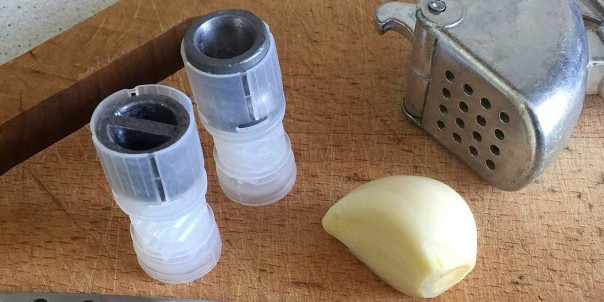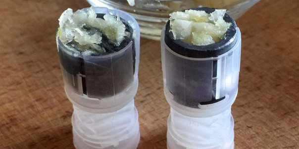 Полости набьём измельчённым сублимированным чесноком. Свежий нарезанный чеснок работает лучше, но имеет сильный демаскирующий запах и по мере высыхания даёт бóльшую усадку, так что количество рабочего вещества со временем уменьшается. Чтобы сублимат не высыпался, закроем полость кусочком скотча (обычного или бумажного). Ещё можно наклеить «дробовой» пыж из рыхлого картона — при попадании в цель он легко разрушится.