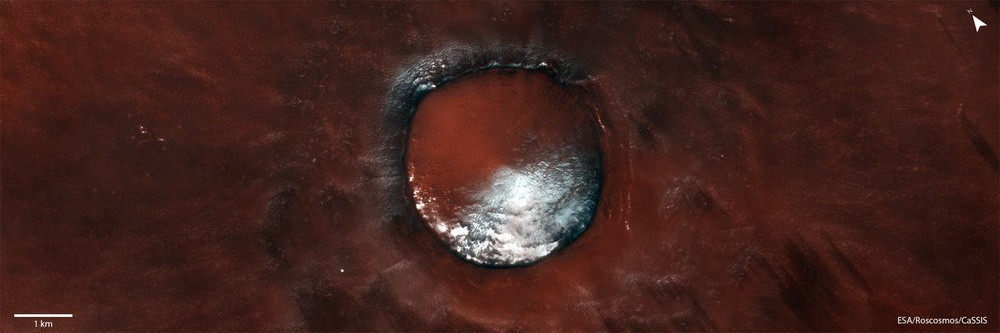 Орбитальный аппарат Trace Gas Orbiter (TGO) предоставил потрясающее изображение кратера диаметром 4 км, расположенного в Ваститас Бореалис, крупнейшей низменной области Марса.