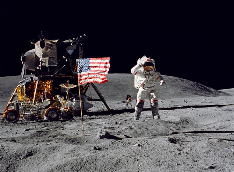 На фото: астронавт Джон В. Янг, командир лунной миссии «Аполлон-16», на поверхности Луны во время первого выхода в открытый космос, 1972 год