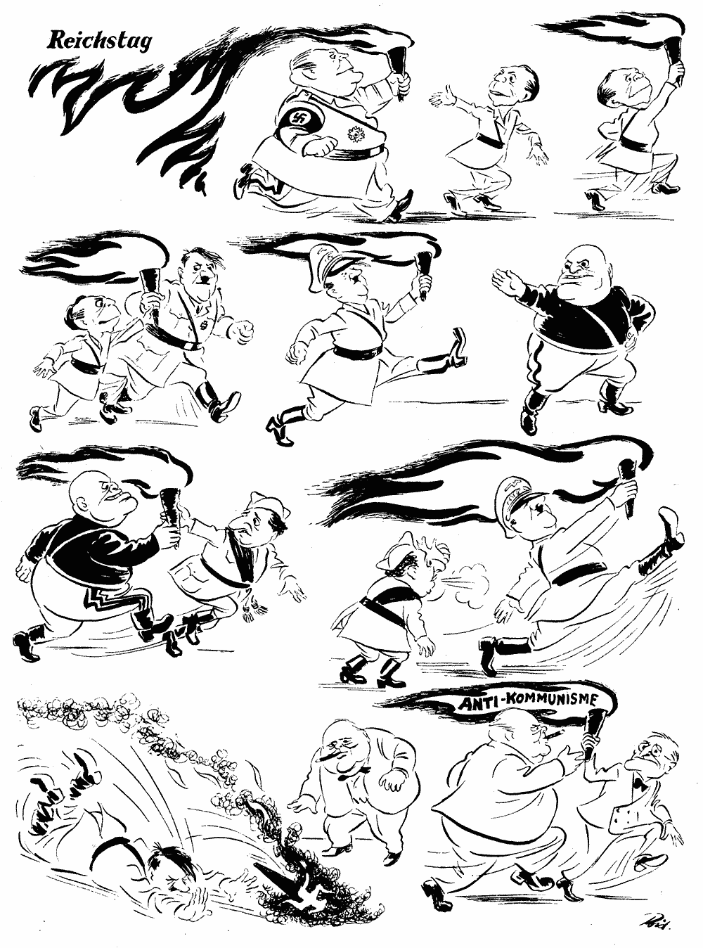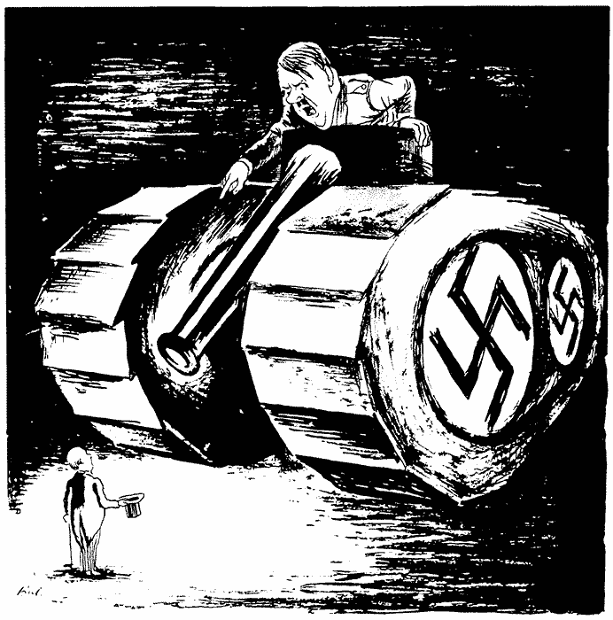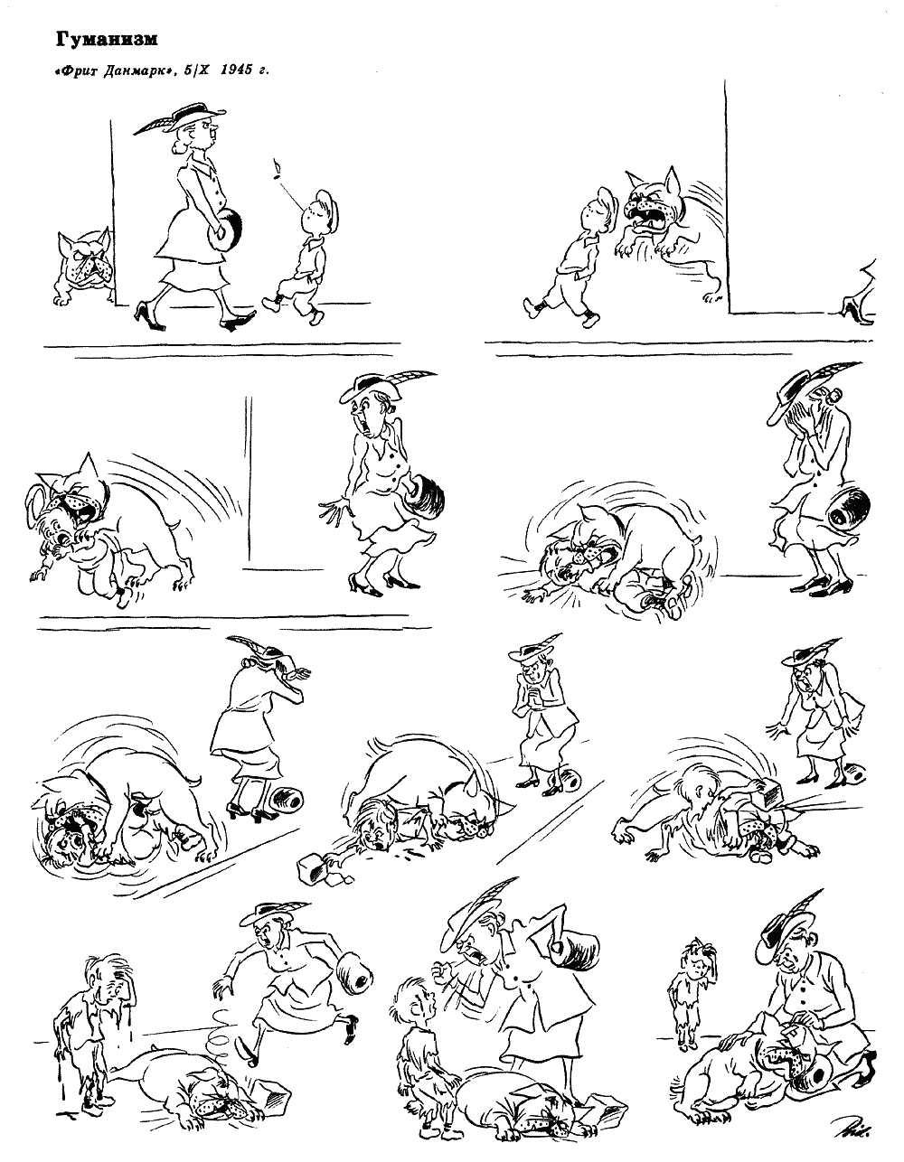 Если в бытность Бидструпа в газете "Сосиал-демократен" ему приходилось камуфлировать свои политические серии рисунков, то это, естественно, было излишне в антифашистском журнале "Фрит Данмарк". В данном случае общечеловеческий подход представлял собой не прикрытие, а усиление издевки над буржуазным "гуманистом". Позже он не раз пользовался этим методом, который, однако, не следует смешивать с камуфляжем.