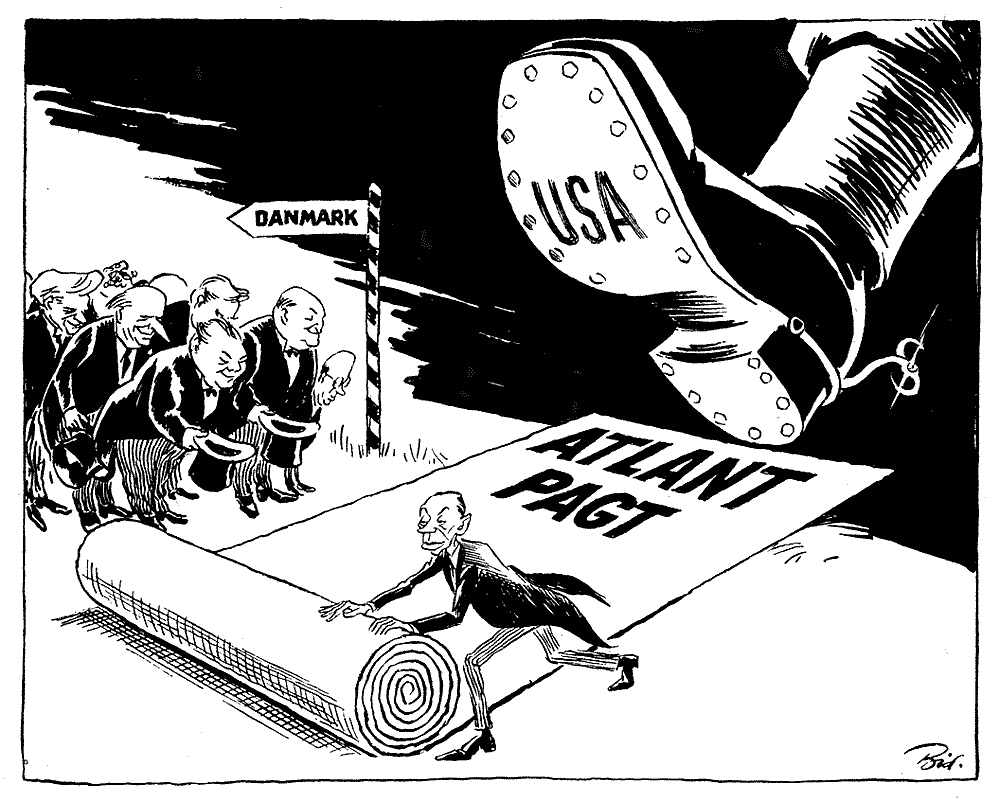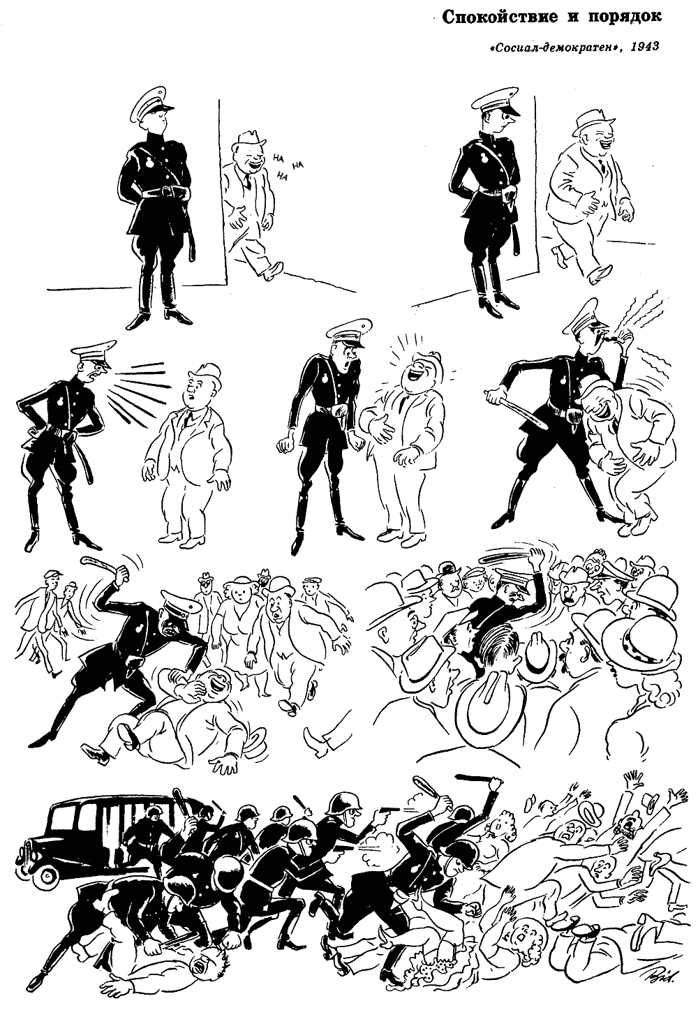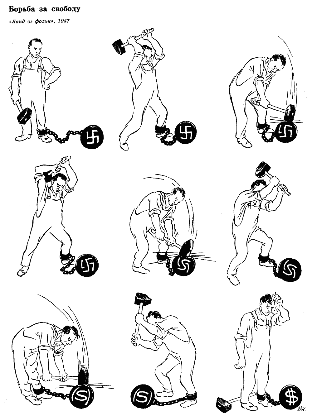 В серии рисунков, озаглавленной "Храбрый страус", датское правительство предстает в образе страуса. Когда фашистская опасность надвинулась на Данию, страус, как и подобает трусливой птице, спрятал голову в песок. Он не возражал, когда Гитлер вырвал у него из хвоста "демократические" перья для собственного украшения, он даже позволил оседлать себя. Только когда был показан фильм о движении Сопротивления Дании, датское правительство стало проявлять "чудеса храбрости". "Бесстрашно" оно разделалось с изображением давно ушедшего к праотцам фюрера. Эти рисунки, следовательно, разоблачали существо политики правительства Дании в период оккупации, в них было показано его далеко не героическое поведение.