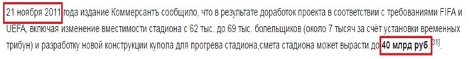 Дело в том, что ЧМ по футболу в 2018 году проходит в России, и наша страна не должна ударить в грязь лицом. Изначально было понятно, что подобного рода стройка не осуществляется за короткое время. Проблемы могли быть различного характера, тем не менее, в 2011 году всё прояснилось.