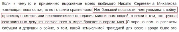 Хочется задать вопрос: Ксюша, ты о чём вообще говоришь?! И как портал «Сноб» может такую сборную солянку, которая напоминает бред человека, находящегося в белой горячке, публиковать, также остается загадкой. Кстати, высказывание Никиты Михалкова о «звенящей пошлости» было адресовано именно Собчак, и теперь понятно почему. А «крылатые» высказывания самой Ксюши по поводу войны и в целом о пошлости, можно послушать в программе Никиты Михалкова Бесогон ТВ.