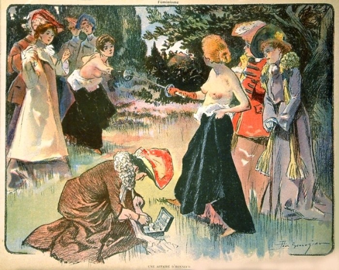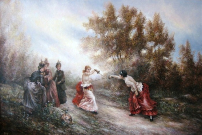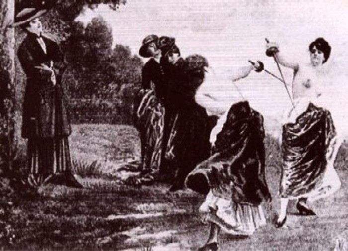 Дамы сражались с особой жестокостью – смазывали кончики шпаг ядом или специальным составом, вызывающим жгучую боль при любом прикосновении, стреляли до тех пор, пока одна из них не была убита или тяжело ранена. Как правило, на шпагах дамы дрались топлес – во-первых, платья стесняли движения, во-вторых, считалось опасным попадание в раны кусочков ткани.