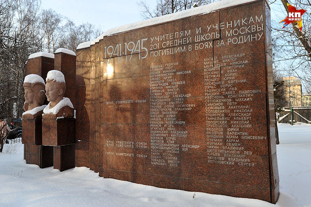 Монумент у московской школы №201 с бюстами Александра и Зои Космодемьянских. Фото: Владимир ВЕЛЕНГУРИН